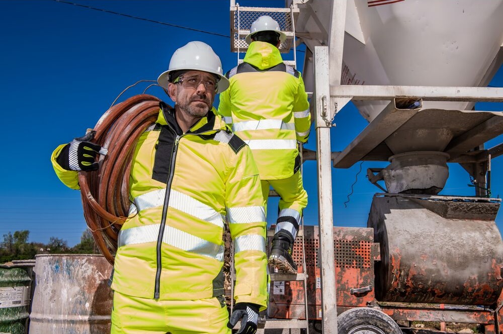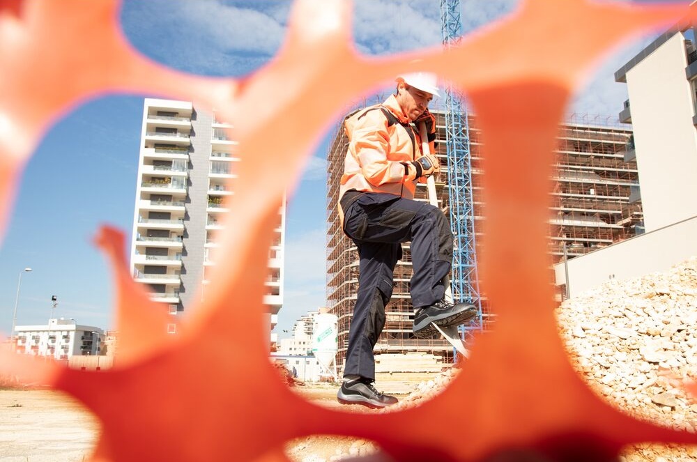 Alta visibilidade, proteção de cabeça, linhas de queda e controlo de área para canteiros ativos.