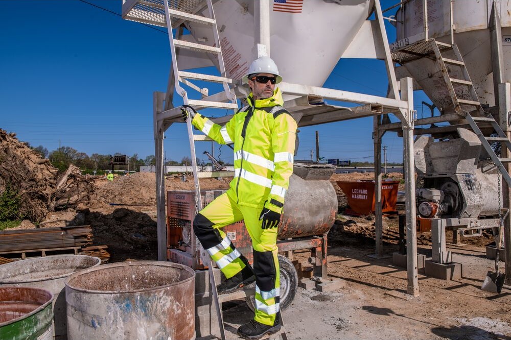Profissional junto a doca marítima com vestuário de segurança de alta visibilidade